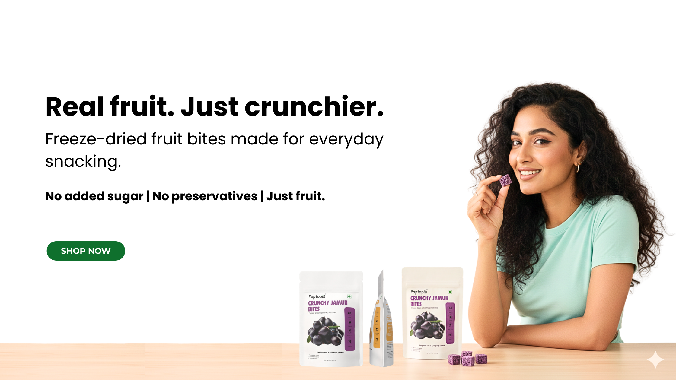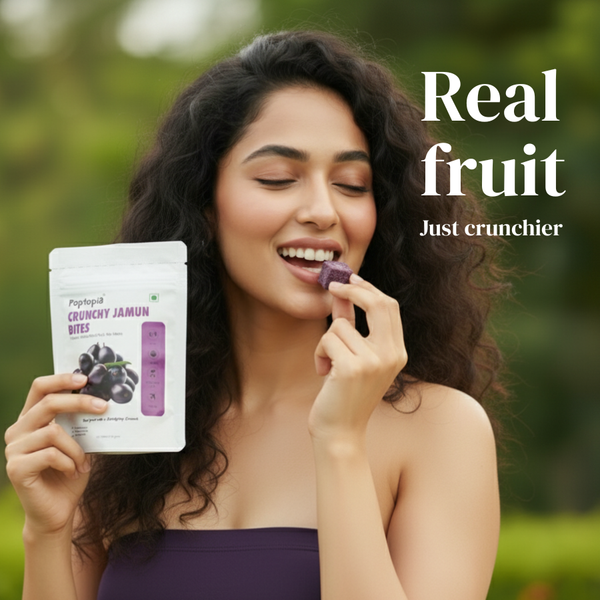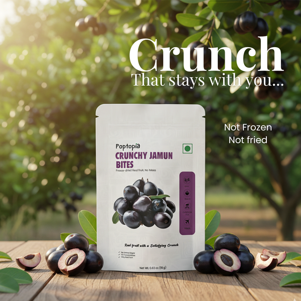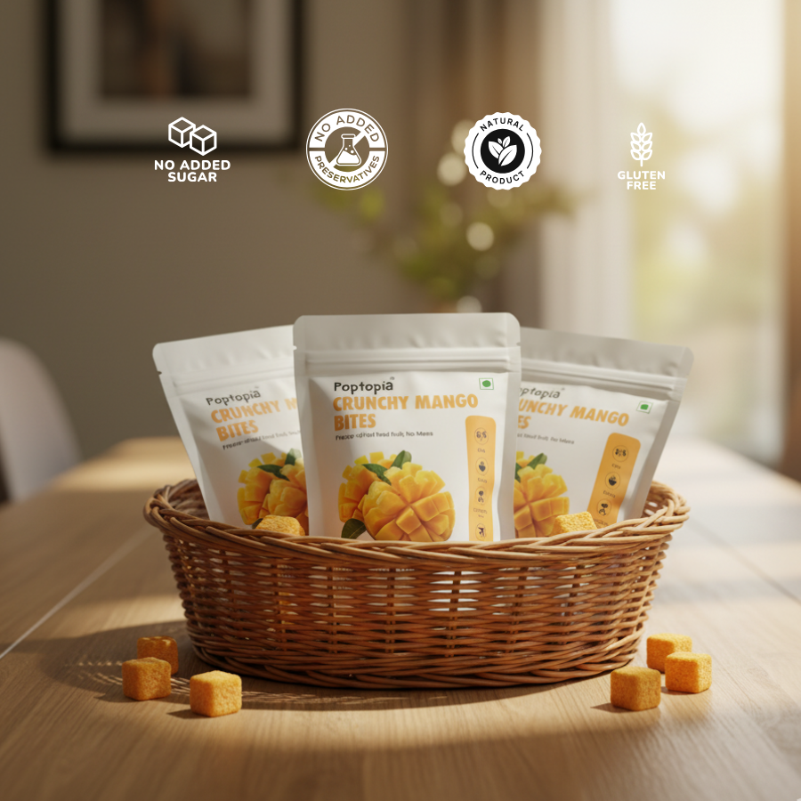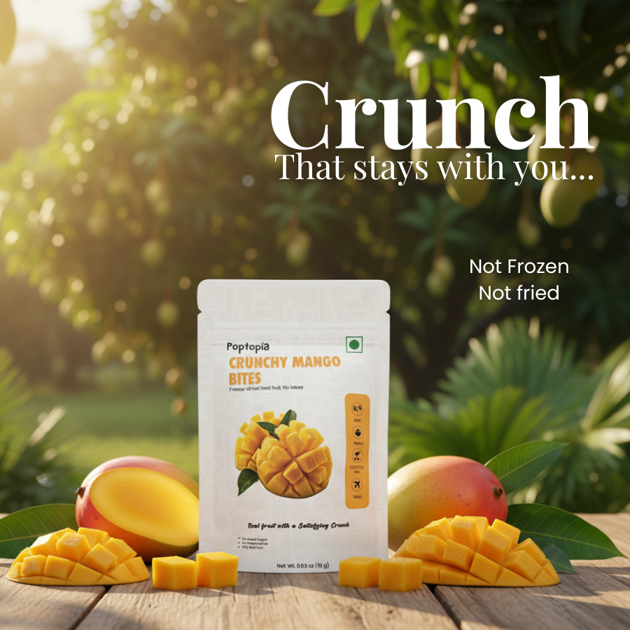 Poptopia Crunchy Mango Bites are made from real ripe mangoes, gently freeze dried to lock in natural sweetness, colour, and nutrition, without frying, added sugar, or preservatives.